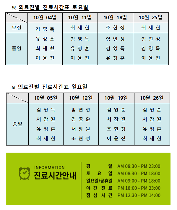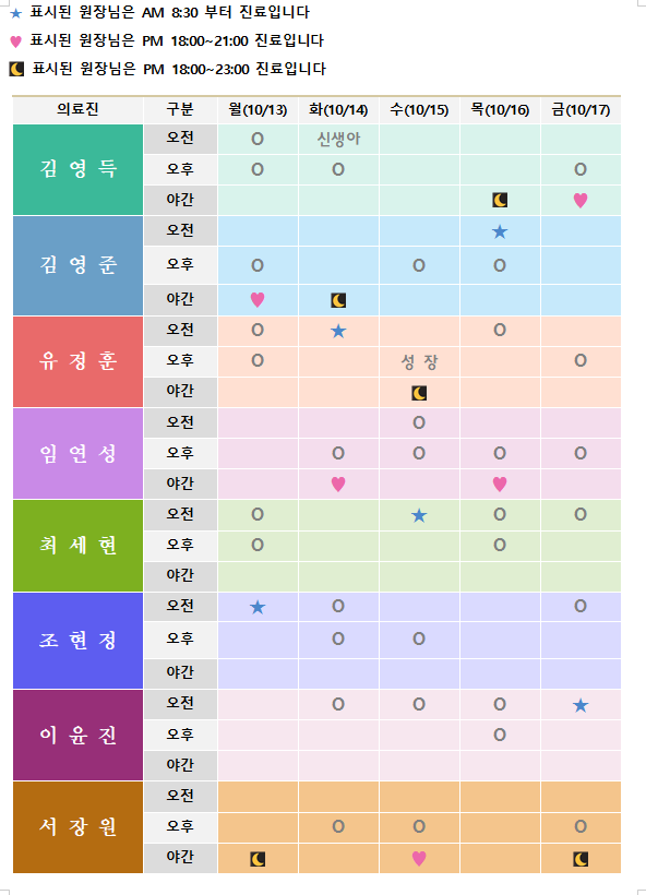 * 10월 13일 ~ 10월 17일 진료 시간표 * 페이지 정보 작성자 김영소아청소년과의원 작성일23-11-03 14:33 조회179,826회 댓글0건 관련링크 이전글 다음글 목록 본문 병원 사정에 따라 진료 시간이 변경될 수 있습니다. 댓글목록 등록된 댓글이 없습니다. 이전글 다음글 목록